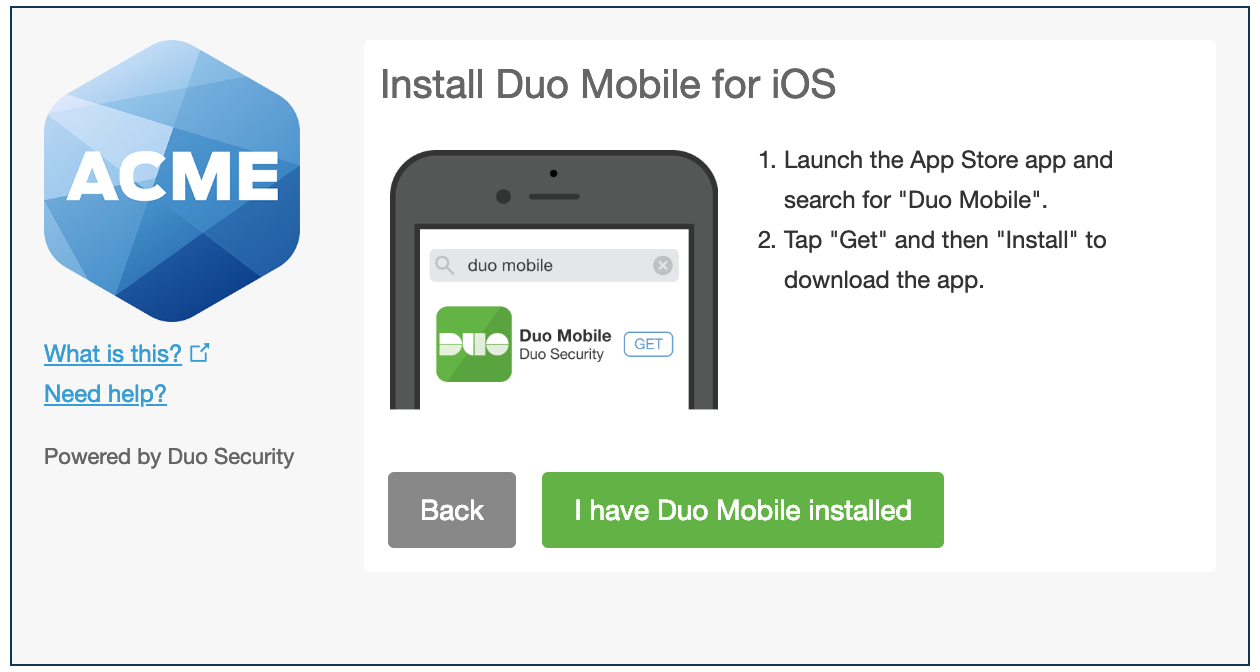 Follow the platform-specific instructions on the screen to install Duo Mobile. After installing our app return to the enrollment window and click I have Duo Mobile installed.